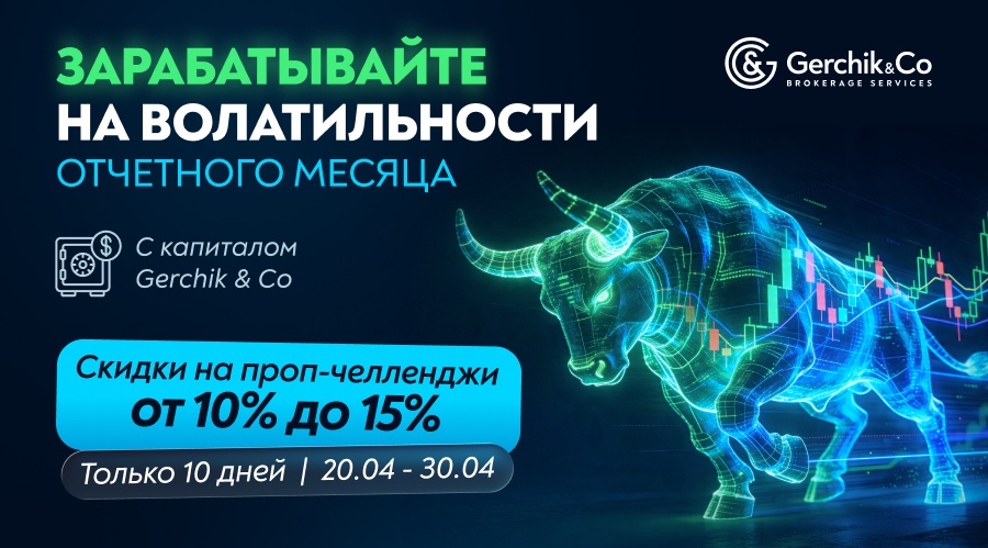 Пока американские гиганты готовятся опубликовать свои цифры, в Gerchik & Co решили сделать вход в «высшую лигу» максимально доступным. Только с 20 по 30 апреля все проп-челленджи доступны со скидкой до 15%. Это ваш шанс забрать профит на волатильности Уолл-стрит, торгуя не на микродепозитах, а на большом капитале компании.
